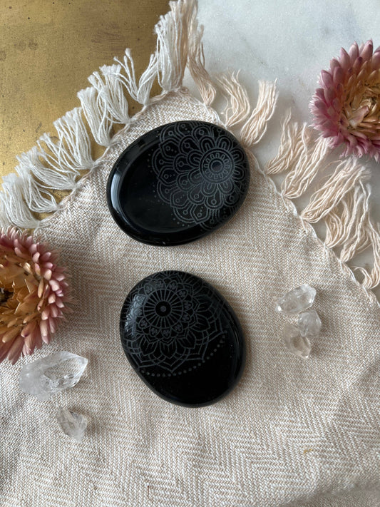Etched Obsidian Worry Stone - Assorted Mandalas