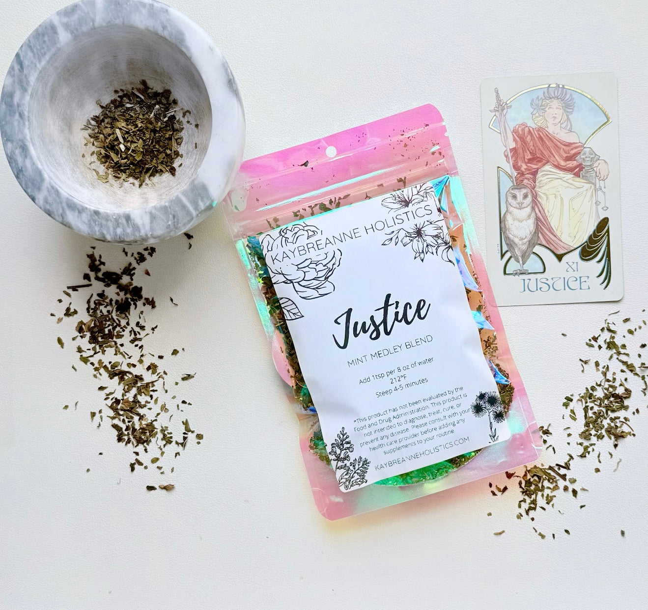 Justice is a hand-blended tea that embodies fairness, balance, and grounding energy, just like the tarot card it’s named after. Crafted with a cooling and refreshing minty profile, Justice is designed to support digestion, clarity, and energetic equilibrium. This blend invites you to slow down, check in with yourself, and restore harmony from within. The Justice card reminds us that everything is connected through truth and karma. This tea honors that sacred balance with supportive herbs for both body and mind.